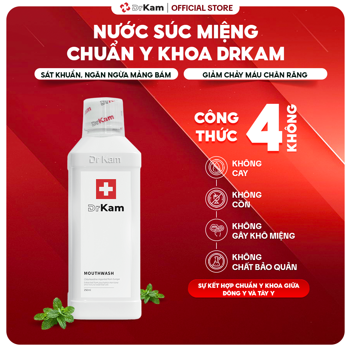 Nước súc miệng chuẩn y khoa DrKam kết hợp Chlorhexidine nhập khẩu trực tiếp từ Châu Âu và Chiết xuất Lá Lấu – dược liệu thiên nhiên quý giá trong dân gian, mang đến giải pháp hỗ trợ cải thiện hôi miệng, viêm nướu, chảy máu chân răng,… một cách hiệu quả mà vẫn an toàn, lành tính. Sản phẩm hoàn toàn không cay, không cồn, không gây khô miệng, không chất bảo quản, phù hợp cho nhiều đối tượng.